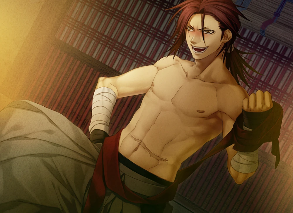 Ah, the ladies man! You know, in the steam achievements for his route one of them is “Does the carpet match the drapes?” referring to his red hair. The steam achievements in this game are wild in general. Anyway, he was the one I was most excited for and looks-wise, my favorite! Sanosuke is known as hot-headed, matching his hair color. He’s so hot-headed, in fact, that he tried to commit seppuku in his past, just because someone dared him to. Thankfully he was not successful, and now he has a cool scar. Yay!